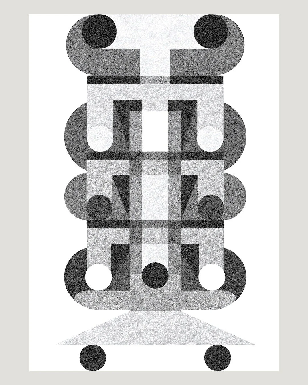 It’s a geometric and monochromatic study in rhythm and symmetry. By stacking interlocking spheres