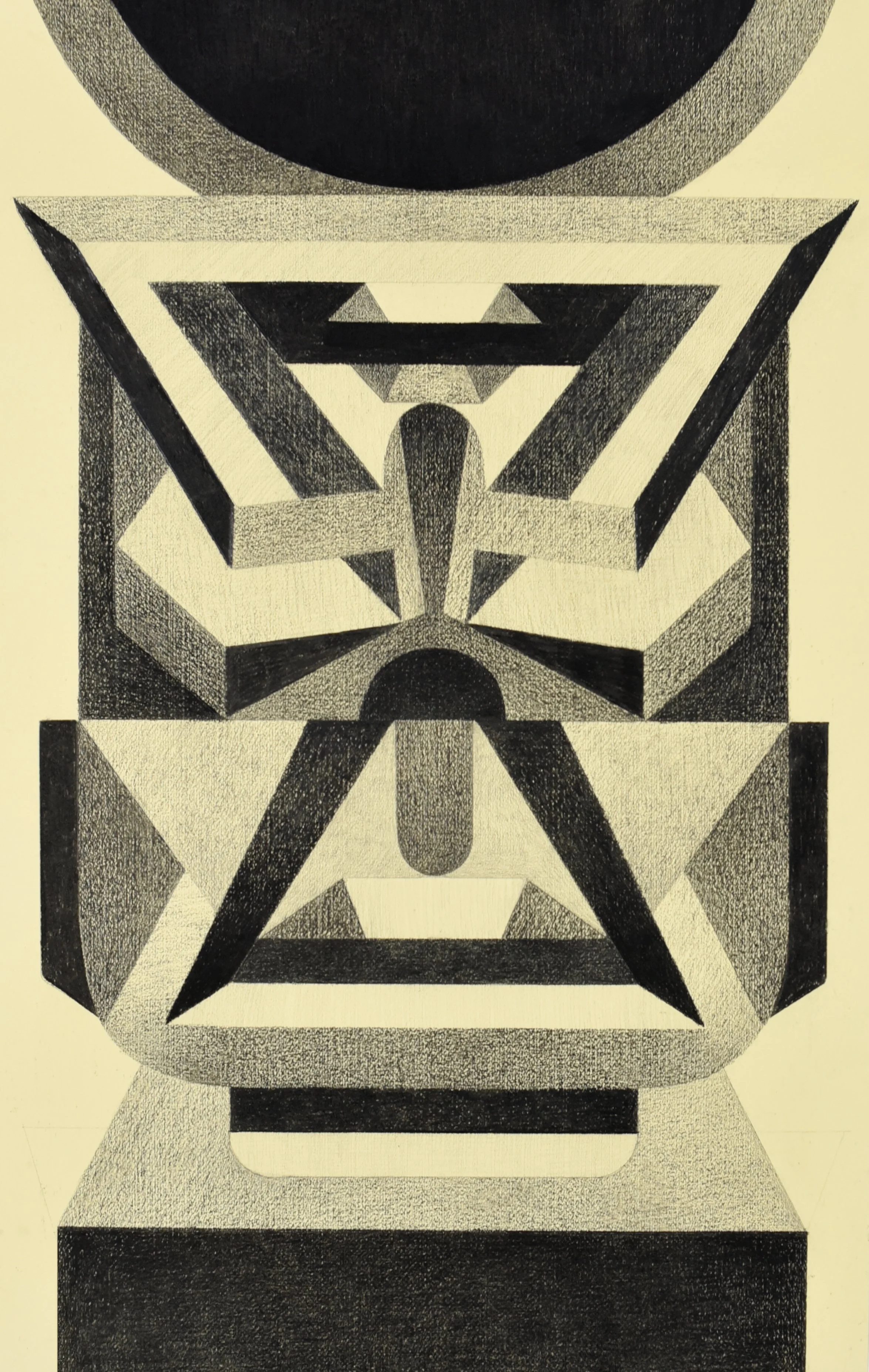 This is a minimalist, hard-edge charcoal drawing based on my collage process. I start with tiny sketches to focus on the big picture without getting bogged down in minor details. Once the composition is locked in, I scale the work up to its final size.